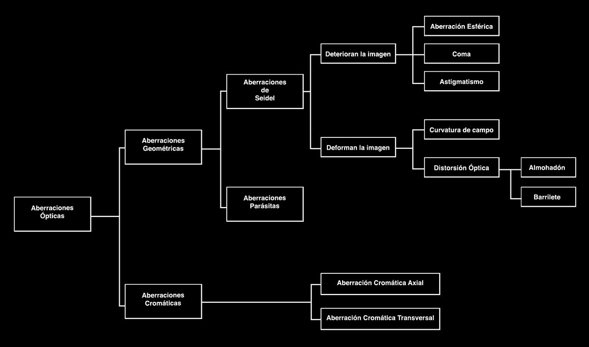 Las aberraciones ópticas se dividen en dos grandes grupos, las aberraciones monocromáticas, mas conocidas como aberraciones geométricas y las aberraciones cromáticas.