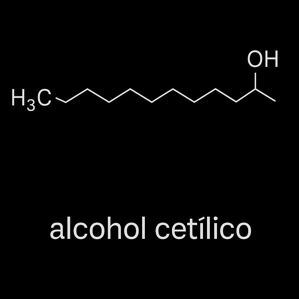 | Alcohol cetílico | C₁₆H₃₄O | 242,44 | Sólido ceroso, blanco, insoluble en agua fría | Insoluble en agua, soluble en alcohol y aceites | Emulsionante, modificador de dispersión, antiespumante |