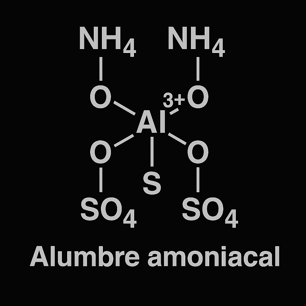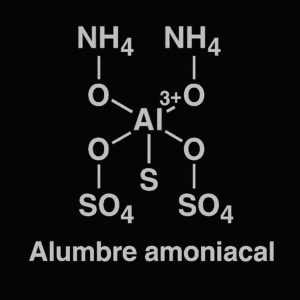 Su fórmula química es NH₄Al(SO₄)₂·12H₂O, con un peso molecular de 453. Se presenta como una sal blanca y cristalina, medianamente soluble en agua a temperatura ambiente. Su uso en procesos fotográficos se concentra en la estabilización y endurecimiento de las emulsiones durante el fijado, contribuyendo a evitar el ablandamiento excesivo de la gelatina.