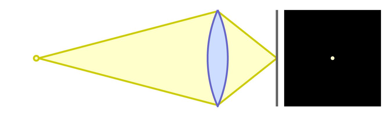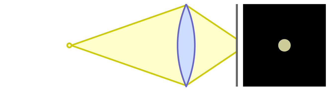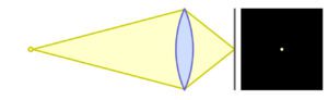 Al enfocar correctamente un punto y usando una lente convergente, los haces de luz deberían converger en forma conjunta sobre el plano focal y definirían un circulo nítido con la forma de un punto.