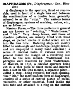 Estos diafragmas de apertura múltiple también se denominaban a veces diafragmas de Waterhouse, debido a su funcionamiento basado en el deslizamiento a través de una ranura en el cilindro de la lente.
