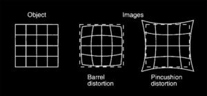 Si se fotografía un objeto consistente o formado por una pared de líneas rectas, las líneas aparecerán rectas hacia el centro del campo pero se curvarán para dentro o para afuera hacia los bordes. Según la forma estas distorsiones se conocen con el nombre de «distorsión de barrilete» o «distorsión de acerico».