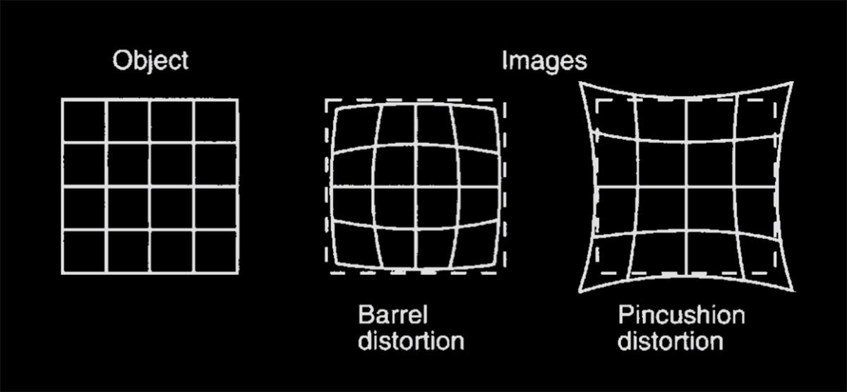 La distorsión óptica no afecta la nitidez de la imagen y solamente altera su forma. Tiene lugar debido a que la parte de la imagen fuera del eje no se reproduce en la misma escala que la porción sobre éste.