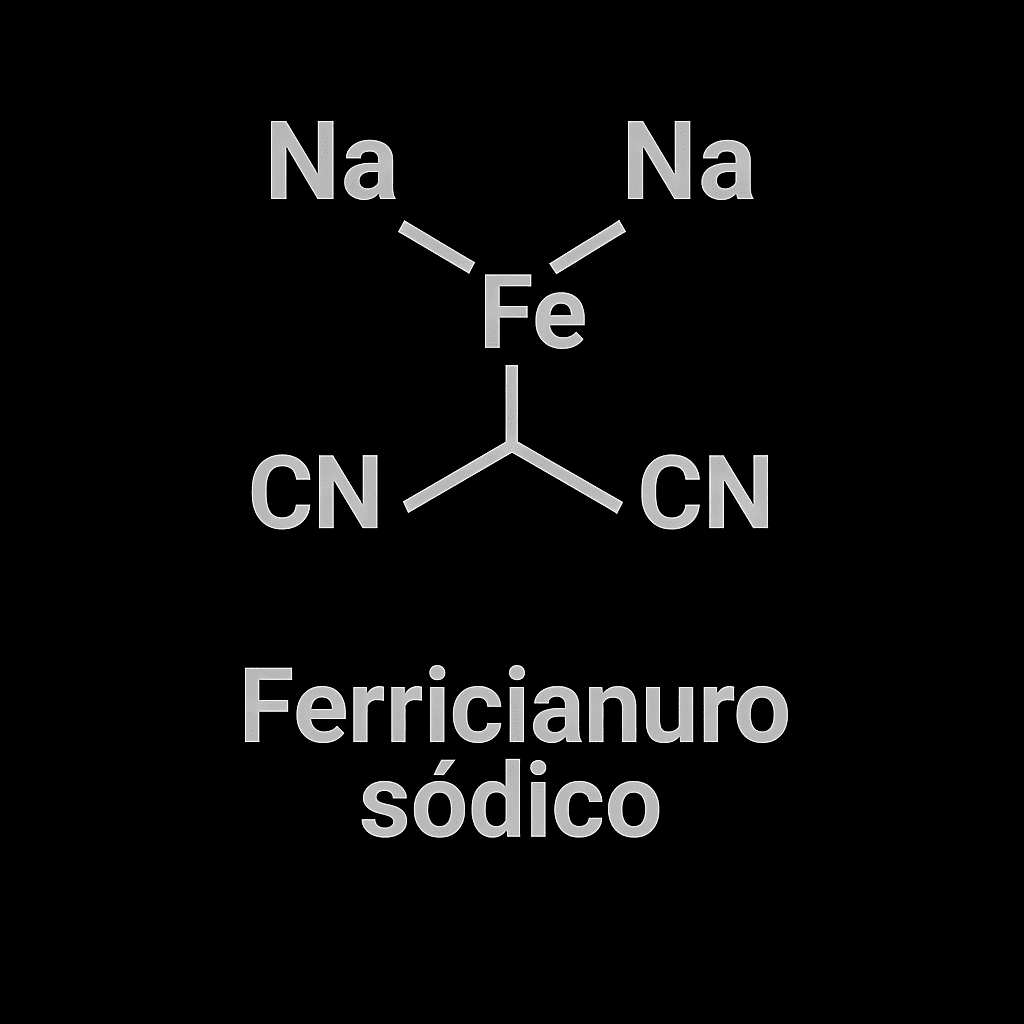 Ferricianuro sódico | Na₃[Fe(CN)₆]·H₂O | 298,97 | Cristales rojo-rubí intensos | Muy soluble en agua |