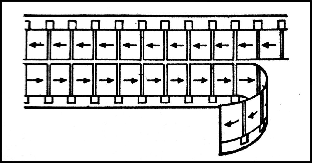 Pasaba por la cámara de cine dos veces: la primera vez, queda expuesta sólo en la mitad de su anchura, y la segunda vez se exponía la otra mitad.