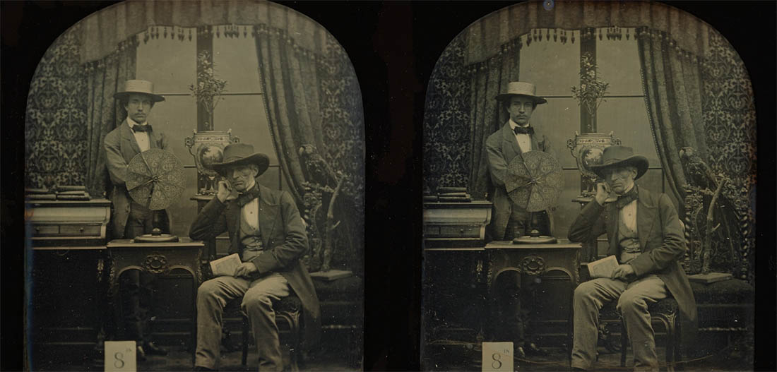 Antoine Claudet, posa con su hijo Francis en el lujoso estudio en el que realizaba sus retratos estereográficos. El espléndido detalle de las cortinas con borlas, el loro, el jarrón decorado y el focímetro, sin duda proporcionaba un efecto impactante al ver la imagen en tres dimensiones a través del visor estereográfico. Este retrato, que forma parte de un experimento para medir distancias exactas en el estudio, como indica el cartel blanco con la inscripción «8 IN / 22 pies» en la esquina inferior izquierda, pone de manifiesto el empeño de Claudet por garantizar la nitidez de la imagen estereográfica.