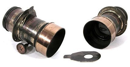 Dos vistas de uno de los primeros modelos Dallmeyer Soft Focus Serie B con una distancia focal de 8½» y una apertura máxima rápida de f/3, con un diafragma Waterhouse insertado (izquierda) y retirado (derecha).