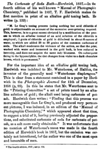 Invención del Sr. Waterhouse fue un baño de tonificación de oro alcalino, descrito en esta página de W. Jerome Harrison, The Chemistry of Photography, Nueva York: Scovill & Adams, 1892.