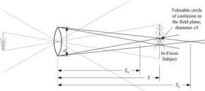 El método de Von Rohr para calcular el DOF (profundidad de campo) implica proyectar puntos de objetos en círculos de confusión en el plano de campo (Einstellebene), con referencia a la pupila de entrada (Eintrittspupille).