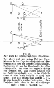 El epígrafe se traduce como: «Fig. 20. Respecto a la profundidad [de campo] con lentes fotográficas Las partes superior e inferior de la figura son idénticas en la posición del plano de campo, la pupila de entrada y el objeto.
