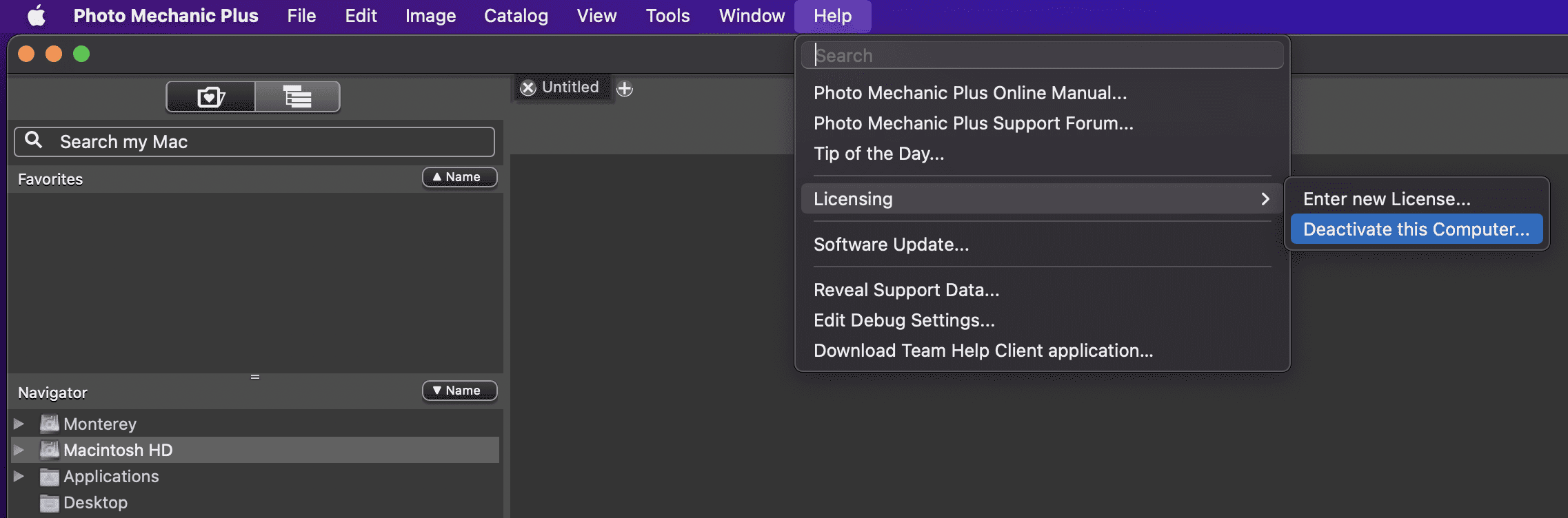 Si ya no usará Photo Mechanic en una de esas computadoras, o desea desinstalar el software, primero deberá desactivarlo para liberar esa activación para usarla en una computadora diferente.