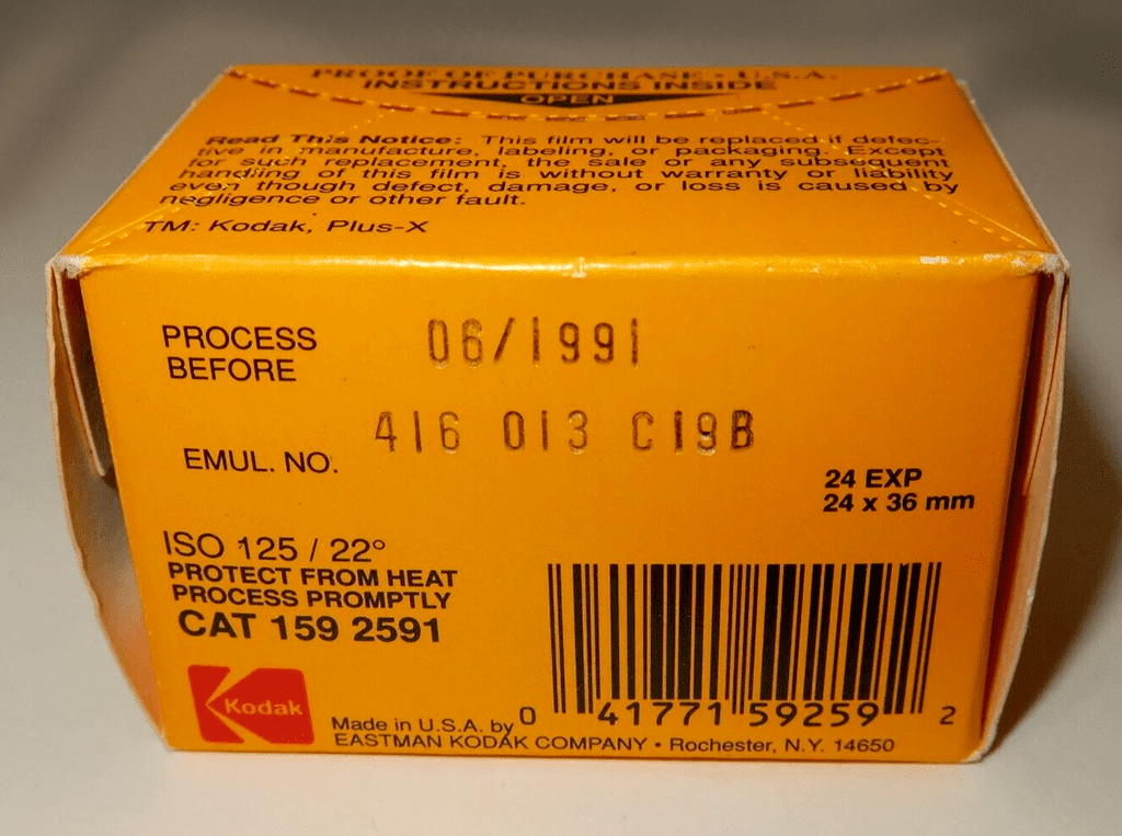 Envase de película con graduación de sensibilidad ISO 125 / 22º, producida en la década de 1990.