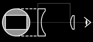 Esquema de un visor tipo galileo, dispone una lente negativa frontal, plano-cóncava y otra lente positiva como ocular, tipo convexa, más pequeña.